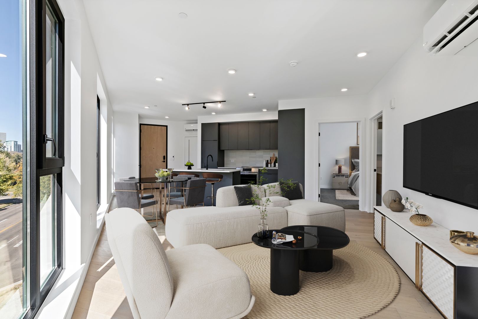 Enjoy an open-concept living area where the kitchen, dining, and living rooms flow seamlessly beneath ceiling-to-floor windows—perfect for entertaining or relaxing.