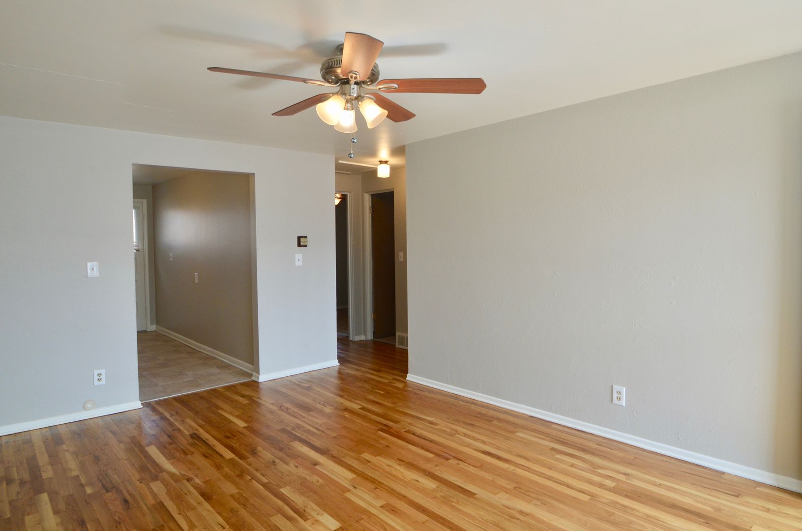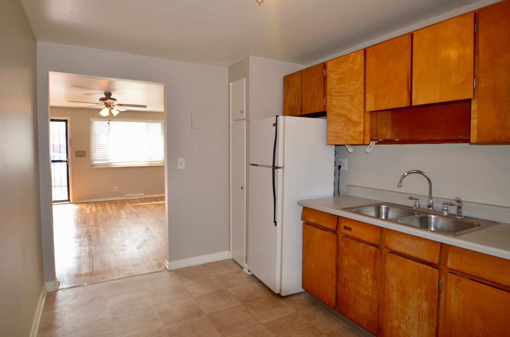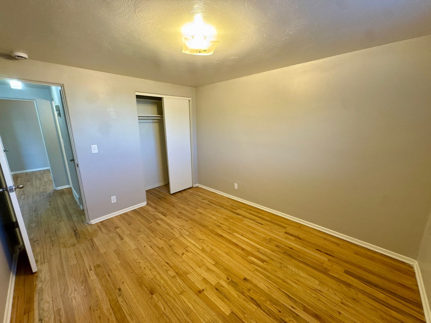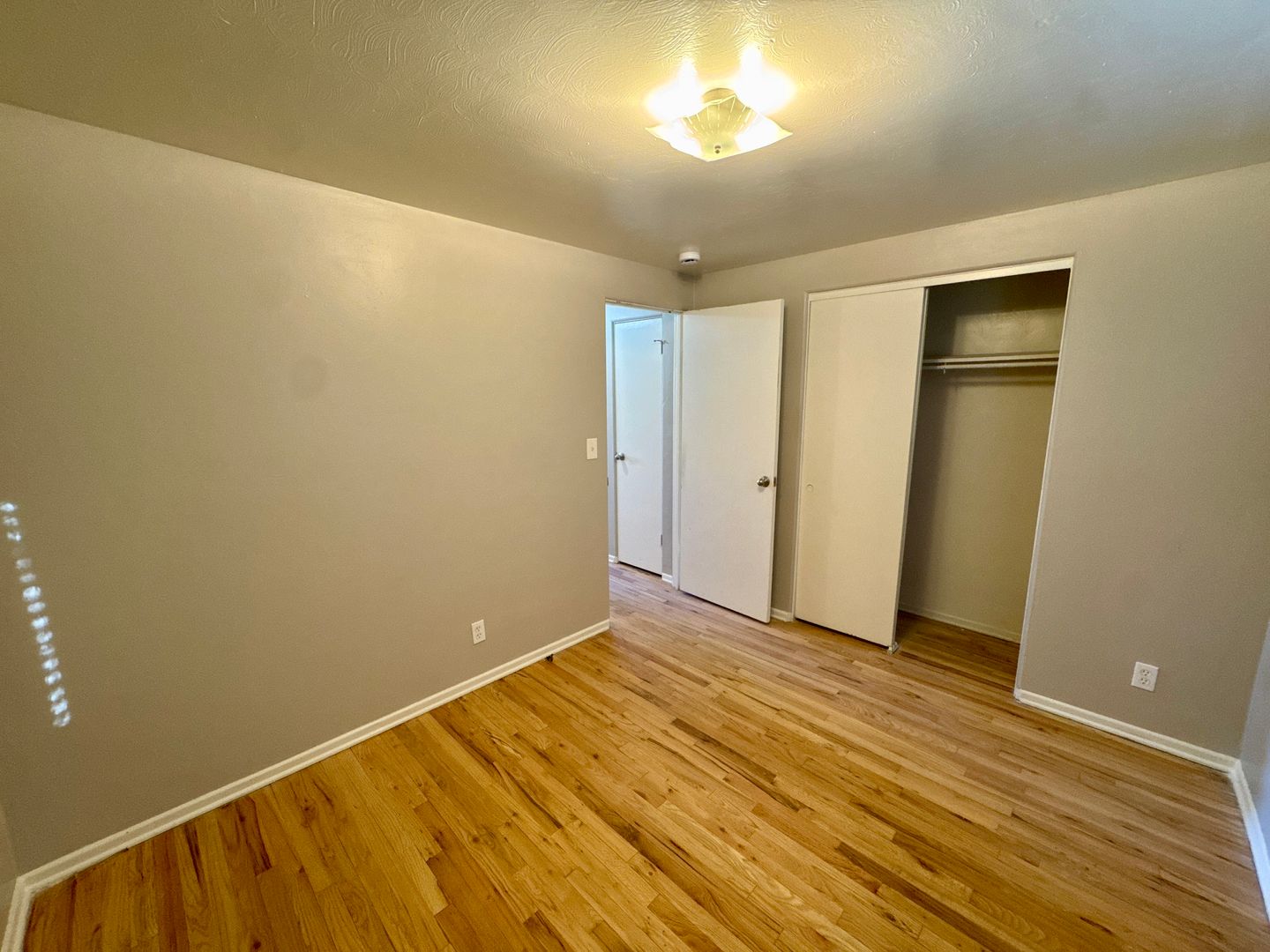 Enjoy the convenience of a ground-level unit with no one above you, plus both front and back entrances. Inside, you'll find hardwood floors throughout the living and bedroom areas, a spacious kitchen with ample cabinet space, tile flooring, and an electric stove. Bedrooms offer large closets, and the primary includes a ceiling fan for added comfort.