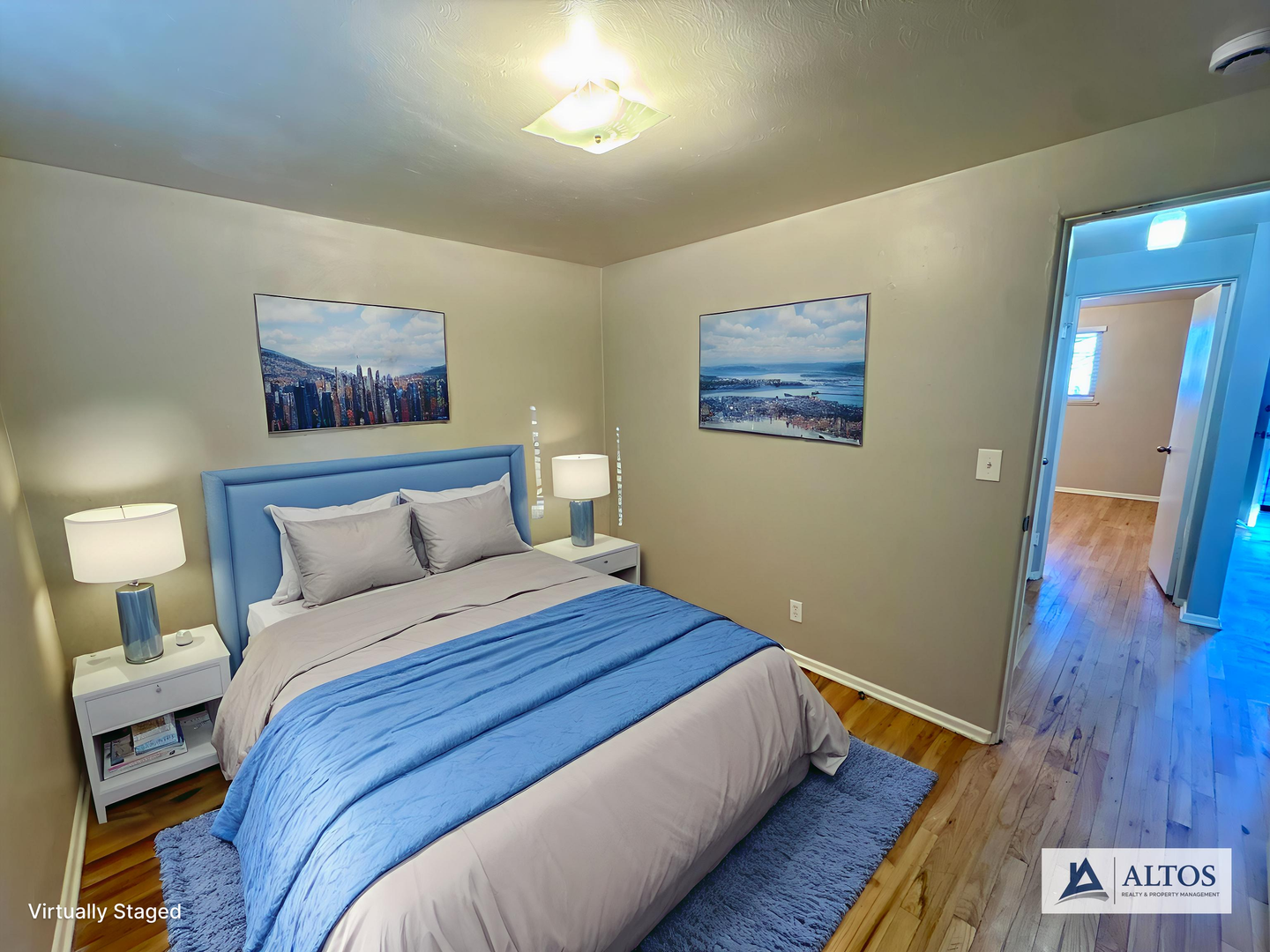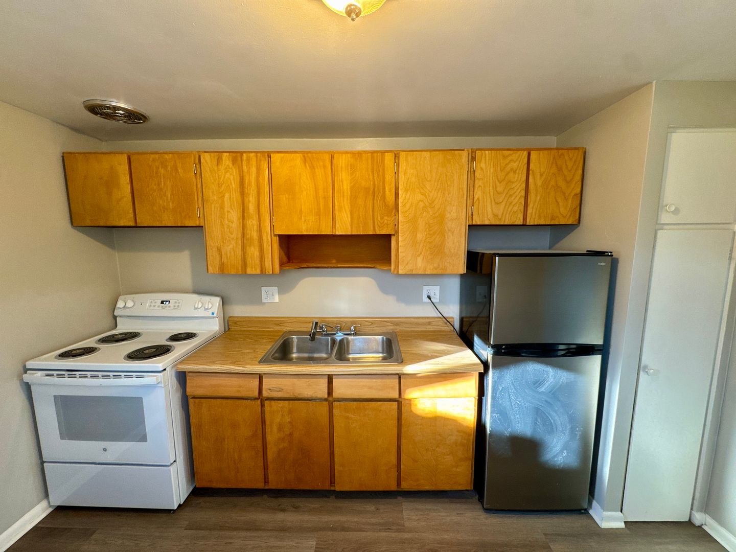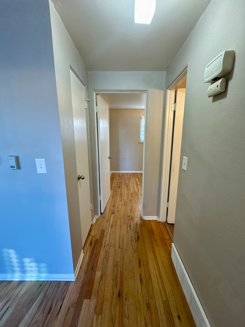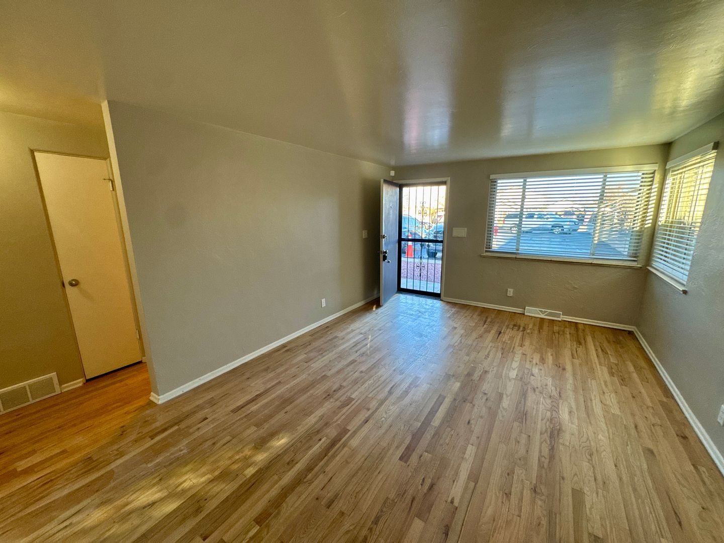 Enjoy the convenience of a ground-level unit with no one above you, plus both front and back entrances. Inside, you'll find hardwood floors throughout the living and bedroom areas, a spacious kitchen with ample cabinet space, tile flooring, and an electric stove. Bedrooms offer large closets, and the primary includes a ceiling fan for added comfort.