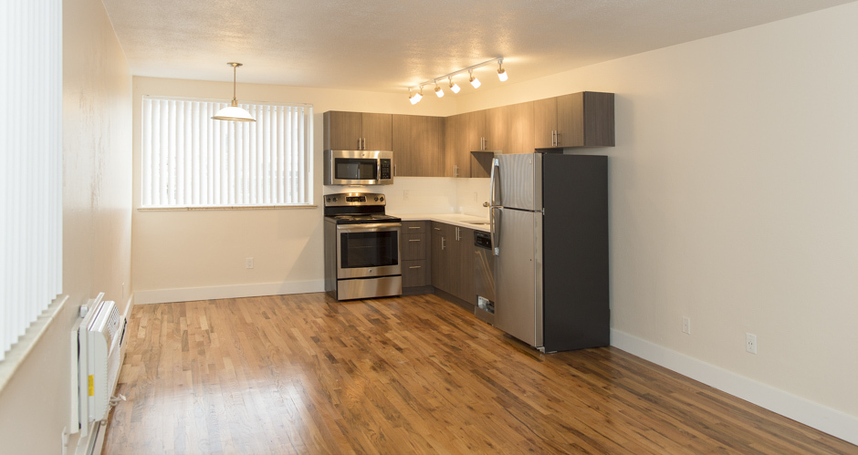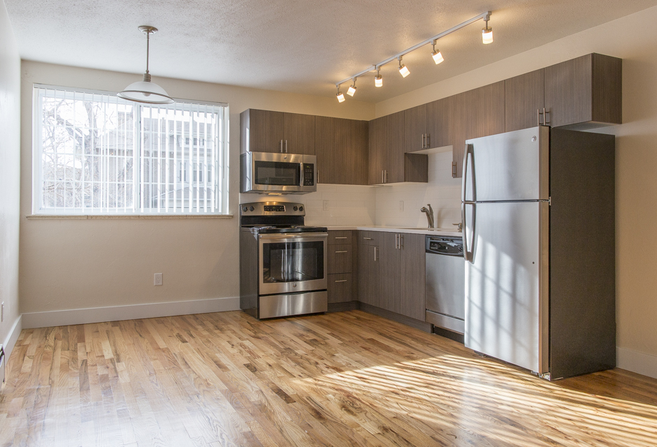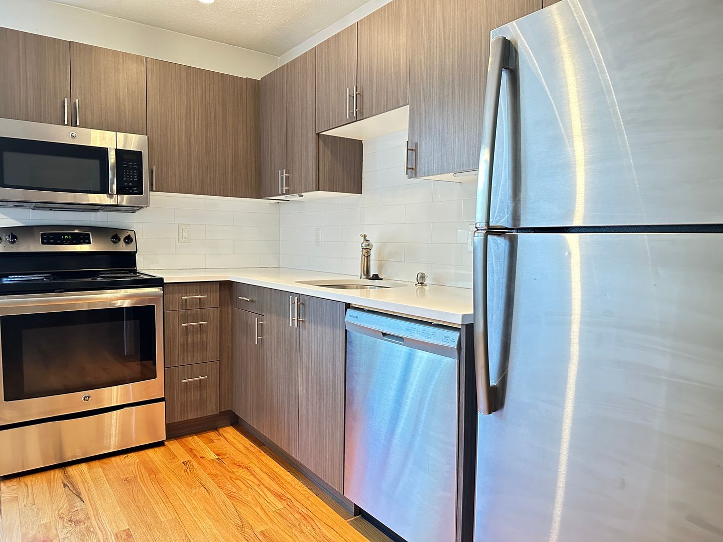 The kitchen includes a stainless steel fridge, stove, and dishwasher.
